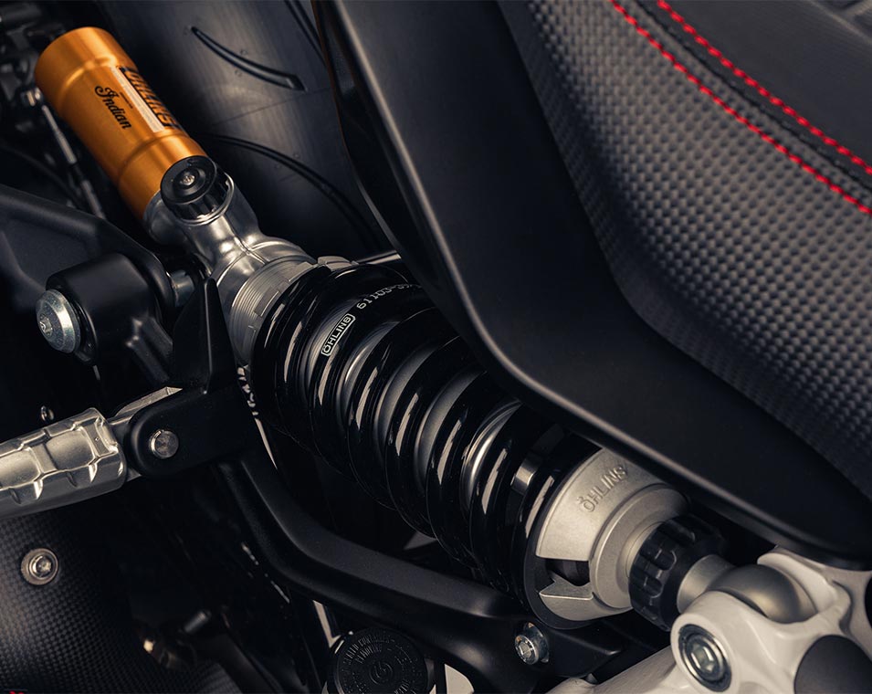 | Sospensione posteriore | Forcella Ohlins nera Piggyback IFP completamente regolabile - 120 mm |