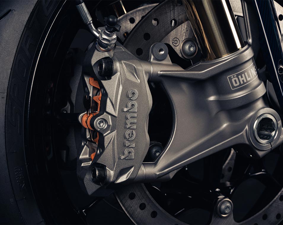 | Sospensione anteriore | Forcella telescopica invertita Ohlins nera completamente regolabile - 120 mm |